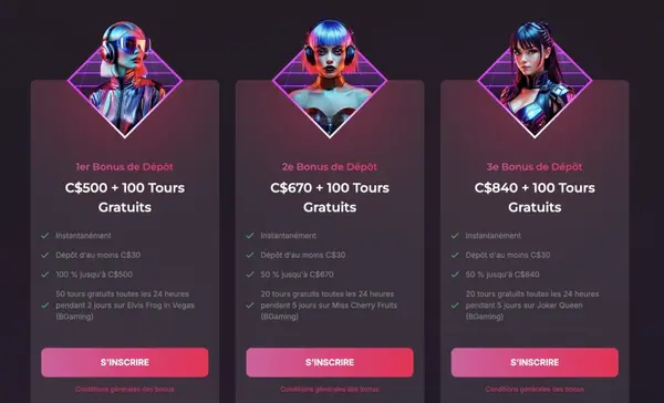 | Fidélité & VIP | 28 niveaux ; gagnez 1 point de statut par €30 misés sur les machines à sous (environ C$45) | Avantages VIP débloqués via la progression ou un jeu à fort volume |